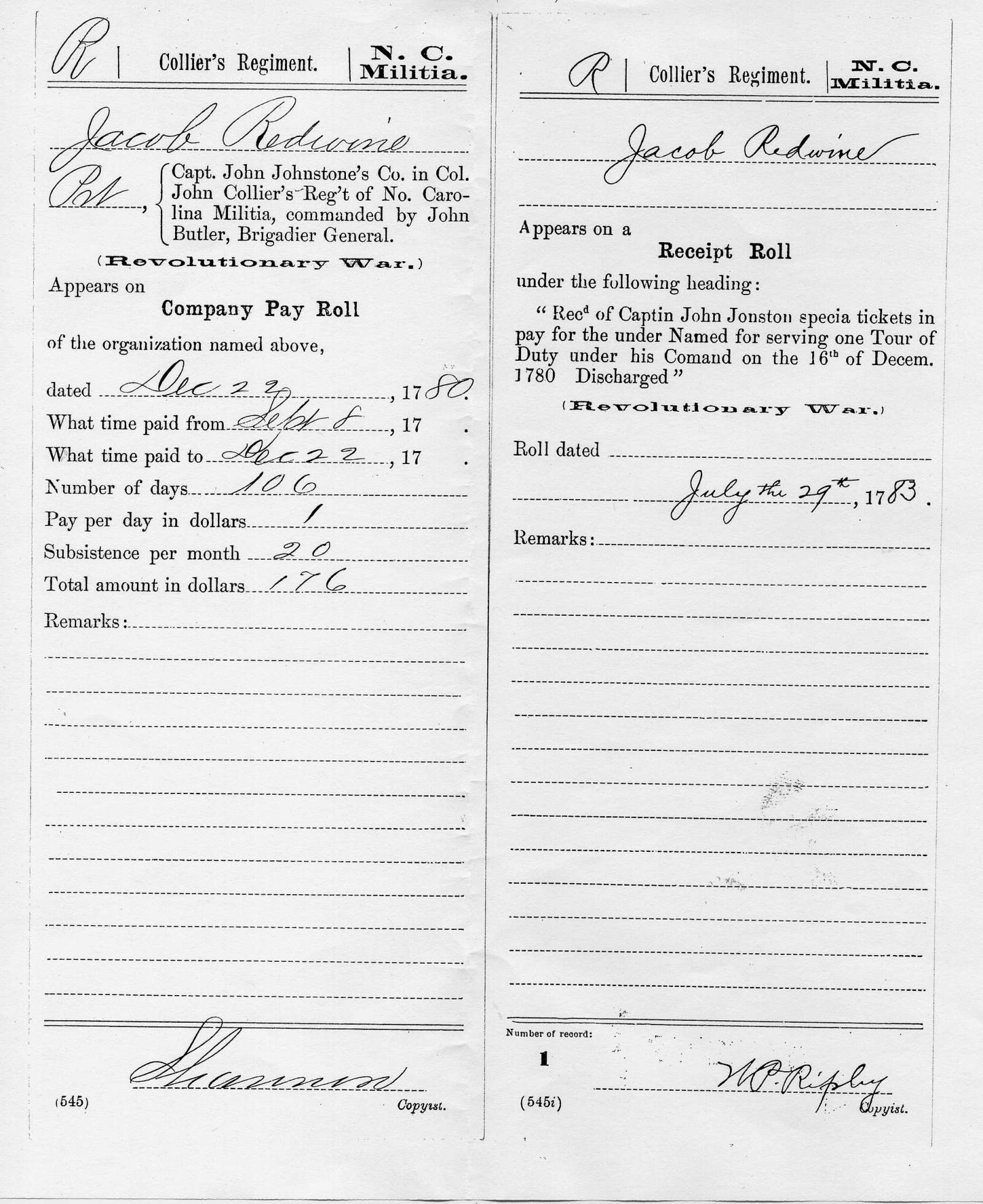 Redwine, Jacob - Revolutionary War Records - 1780-1783