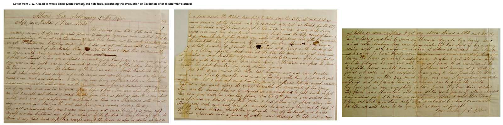 Allison, J. Q. Letter to wife sister (Jane Parker) dtd Feb 1865, describing the evacuation of Savannah prior to arrival of Sherman