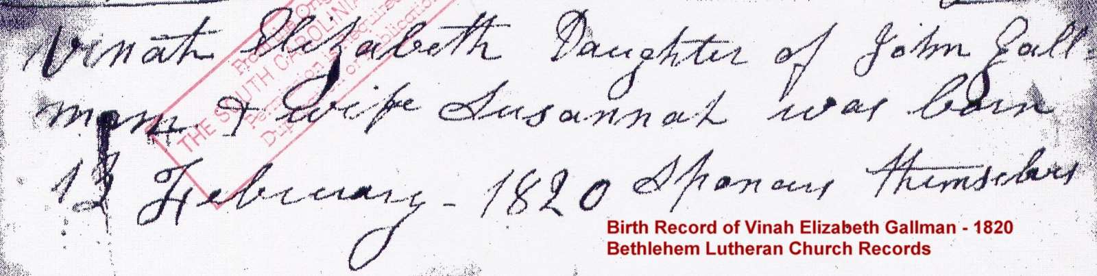 Gallman, Lavinia "Vinah" Elizabeth - Bethlehem Lutheran Church Birth Record - 1820