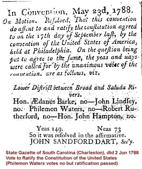Waters, Philemon - SC State Convention Vote to Ratify US Constitution - 1788